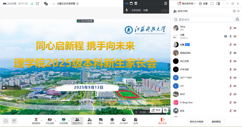 学院党委副书记周志辉介绍2025级新生的基本情况和学院学生工作队伍,重点介绍了学院的学生思想政治教育、学生管理规定制度、心理与安全教育、奖助贷育人体系、综合素质拓展平台和就业升学情况。在家庭教育方面,她建议家长尊重学生独立性,注重沟通与信任,避免过度干预或放任不管;鼓励家校协同,关注孩子身心健康与全面发展,共同助力其顺利适应大学、成长成才。