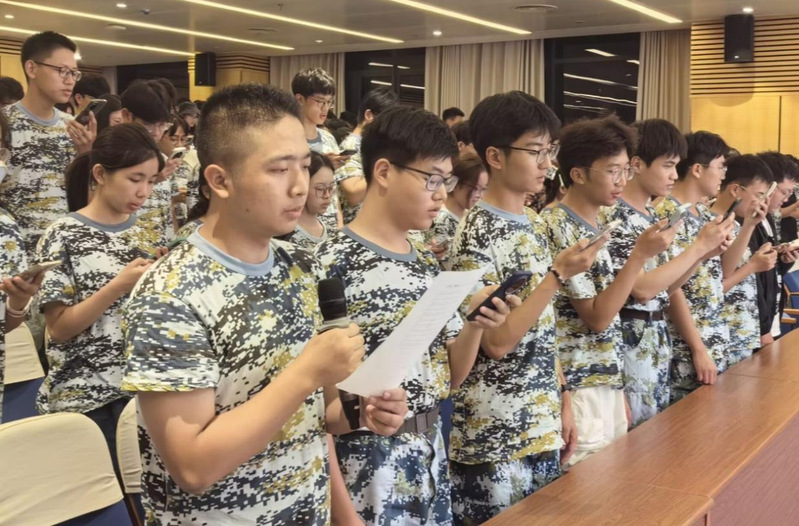 讲座结束后,全体新生在学生代表带领下庄严宣读《防范电信网络诈骗承诺书》,用铿锵誓言表达抵制诈骗、守护校园安全的决心。