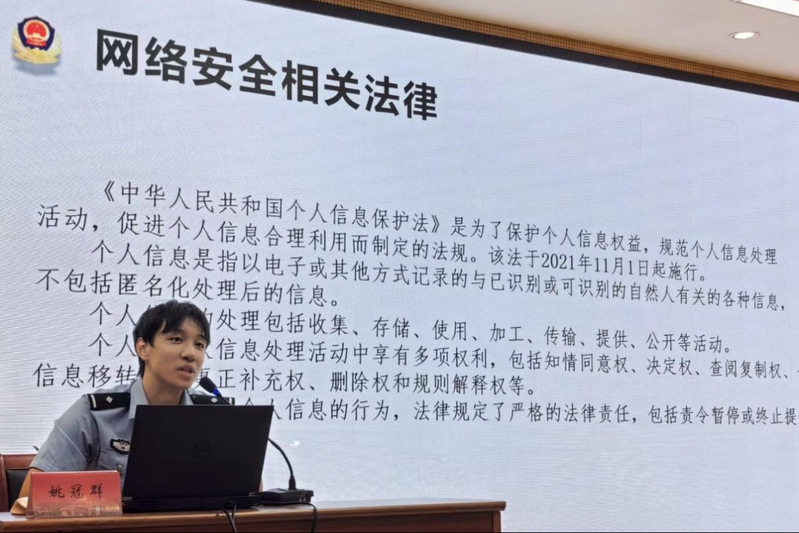民警姚冠群则围绕“国家网络安全”展开专题讲解,他以《网络安全法》《数据安全法》《个人信息保护法》等法律法规为切入点,明确告知同学们:“网络不是法外之地,每一条发言、每一次操作都要承担法律责任,绝不能触碰法律红线。”