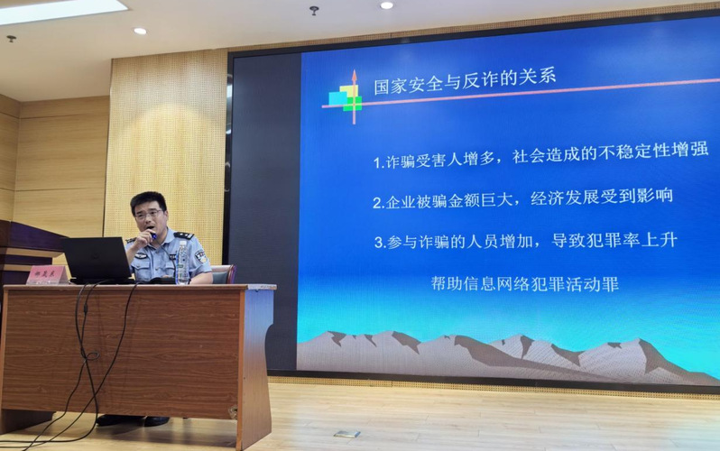 随后,丹徒区长山派出所副所长娜晟东为新生带来内容丰富、案例详实的专题讲座。讲座围绕“国家安全”与“防范电信网络诈骗”两大核心主题展开。他结合当前国际国内形势,用通俗易懂的语言为新生阐释了国家安全的核心内涵、维护国家安全的重要性,介绍了与大学生息息相关的政治安全、网络安全、文化安全等领域的基本知识,引导同学们深刻认识到“国家安全,人人有责”,自觉成为国家安全的坚定维护者。